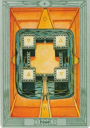 Esta imagem é um símbolo perfeito de poder dos quatro de discos, mas em nossa opinião ela é ultrapassada por uma imagem menos chamativa, mais feia, porém ainda mais esotérica. Dê uma olhada nos quatro de discos do Tarot de Crowley – Harris (Thoth):