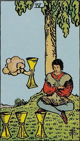 No naipe de copas, o queridinho dos românticos, o quatro vem como o quadrado já satisfeito de romance, de sexo e afeto mas fazendo por fazer, luxurioso, já quase sem se importar, como quem come a quarta fatia de torta só para sentir o gosto mesmo, sem fome.