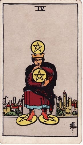 Agora dê uma olhada no “quatro de discos” do Tarot de Waite – Smith, o segundo Tarot mais artístico e bonito da história (desculpe Waite, aqui somos Crowleyrianos):